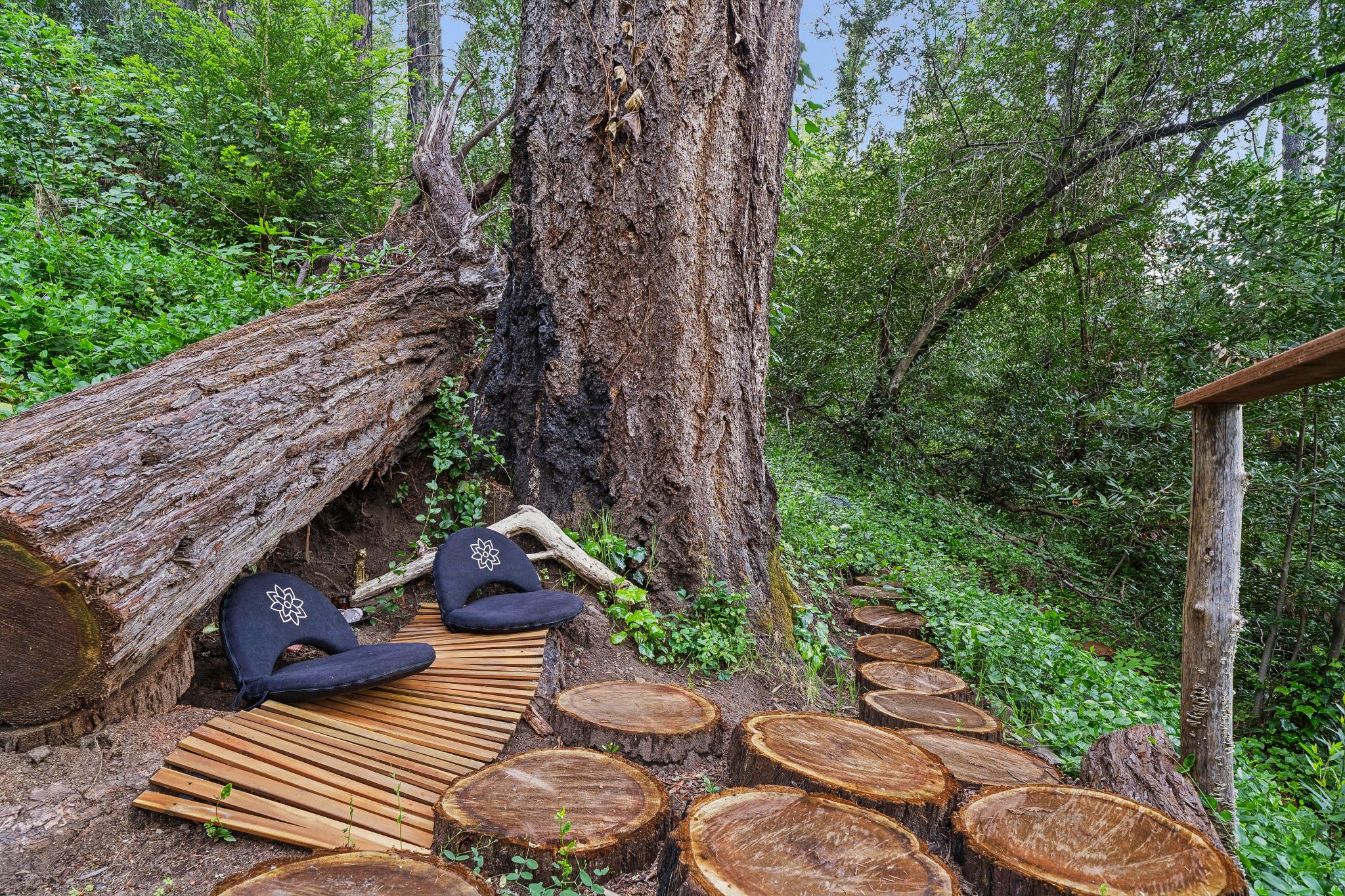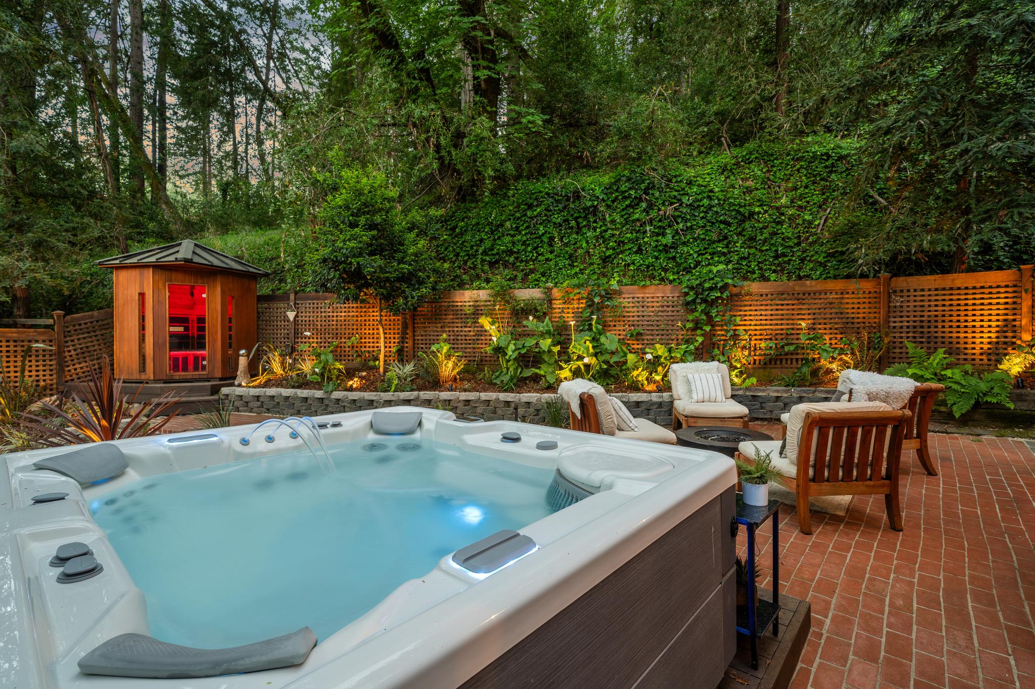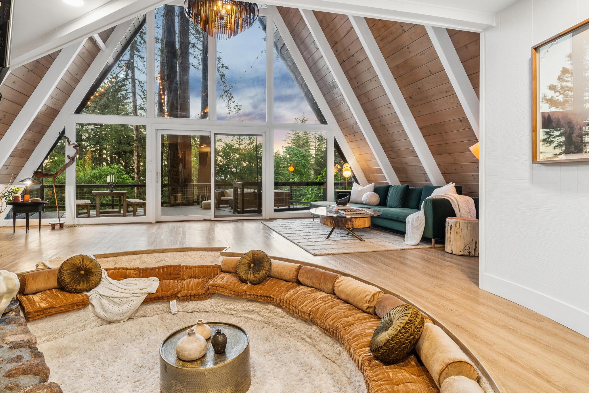 Summit House Napa is a private 1969 A-frame rental at the summit of Mount Veeder in Napa Valley, fully renovated in 2026 and offered exclusively for 31-night-minimum residencies under Napa County’s short-term rental ordinance. Three bedrooms, 2.5 bathrooms, and capacity for 11 guests sit on several private acres of ancient redwoods at 1,800 feet, well above the valley fog line. Wellness amenities include a hot tub, infrared sauna, outdoor shower, and meditation trail. The renovated interior preserves the original three joined A-frame geometry, sunken conversation pit, and river-rock hearth. Starlink satellite internet supports remote work; downtown Napa is 15 minutes away by car. Designed for extended stays — sabbaticals, creative retreats, harvest seasons, and remote-work months.